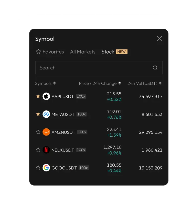Trade U.S. stock with up to 100x leverage. Fully settled in crypto, no bridging required.